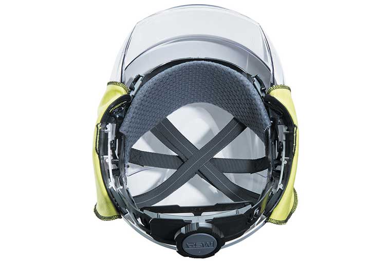 The FOX safety helmet has slots for visor fitting, small hooks for headlamp fitment and side slots for hearing protection fitment.